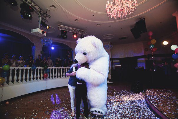 На свадьбе мишутка будет встречать гостей, радовать их, развлекать, шутить, также делать с ними красивые фото. Свадьба с белым медведем запомниться на долго!