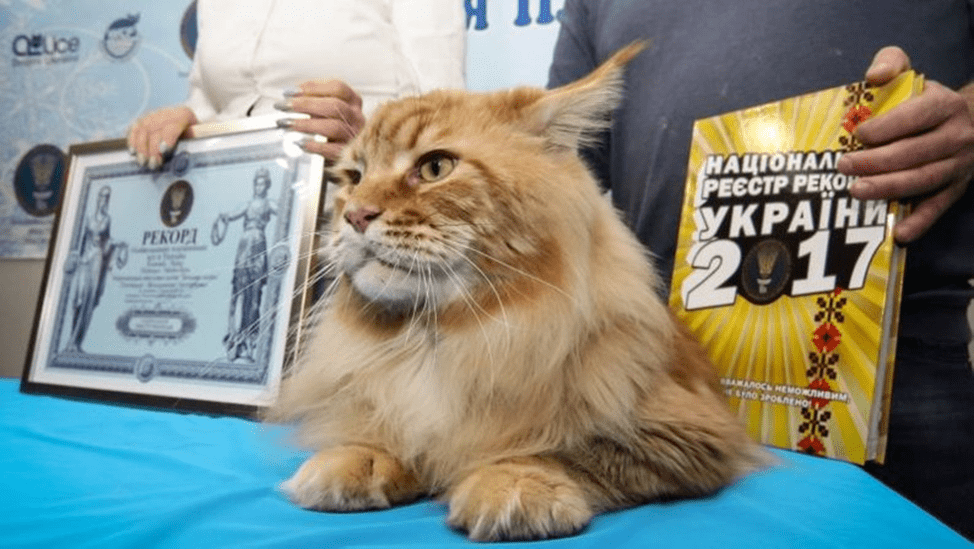 Другой необычный рекордсмен — кот Кекс. Владимир Нестеренко стал хозяином самого большого кота в Украине породы мейн-кун. Кекс попал в Книгу рекордов Украины с весом 11 кг 760 г, а его длина составляла 121 см. Длина хвоста котика — 37 см.